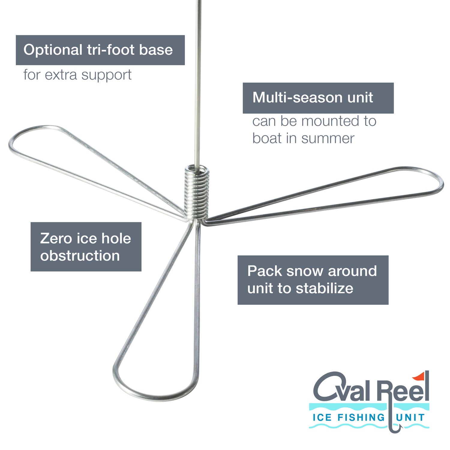 Vertical shaft extends through the Tri-foot base coil, into the ice, just drill a 1/8" hole for added support